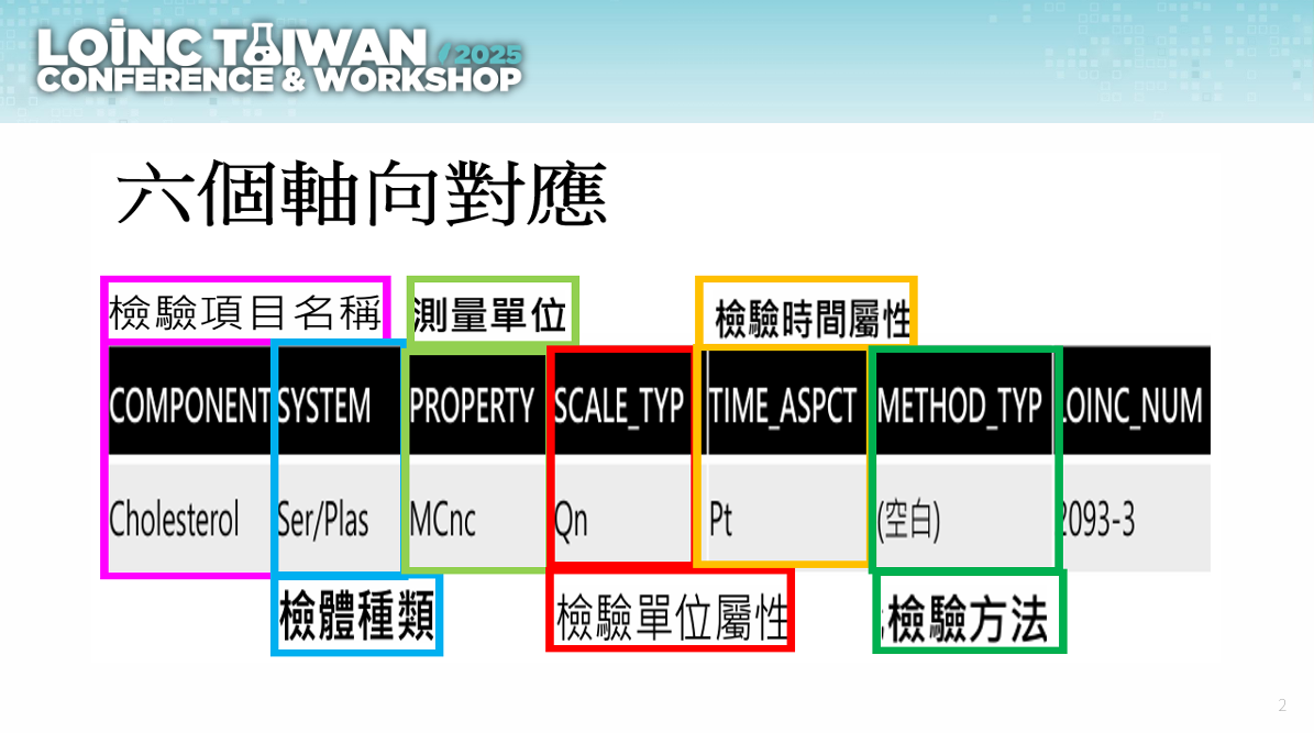 闕醫師指出,資訊學會提出的LOINC六個軸向對於定義檢驗碼已相當清楚,但他個人認為應再增加一個軸向:「檢驗結果的layout格式化」。這個新增軸向將規範數字的呈現方式,以及定性報告中多樣詞彙的統一,例如「陽性」可能被稱為「pos」、「陽性」或「reactive」。他強調,這些細節若能統一規範,將有助於健保資料庫的優化,未來便可更有效地產生累積性報告。