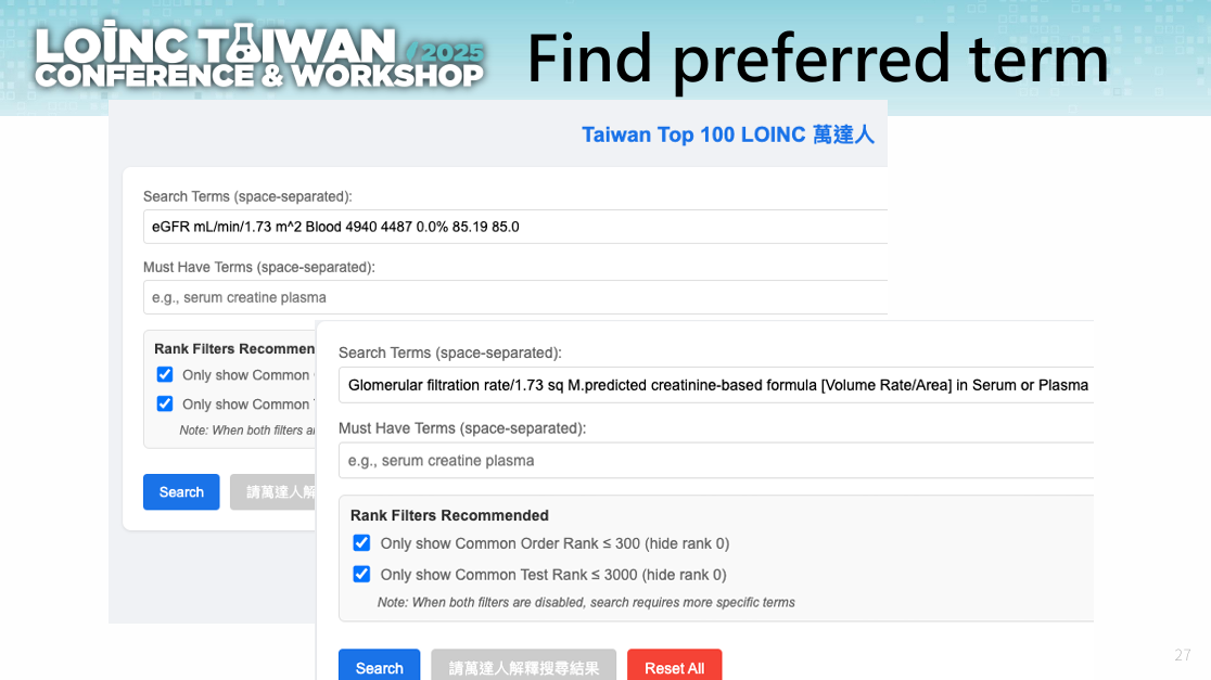 圖十二、LOINC 搜尋工具: 輸入 → 篩選 → 快速找到偏好術語 (Preferred Term)