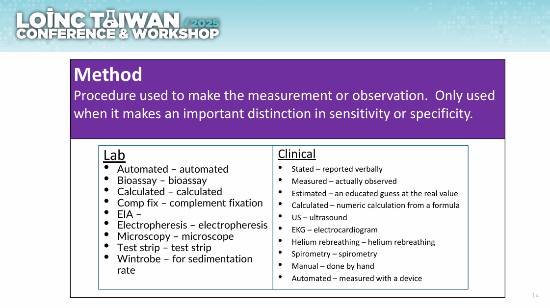 - 對於「方法(Methods)」的選擇,委員會建議多數情況下選擇「Methodless」,將方法資訊作為備註放在H07 OBS的Message中,以減少複雜性,但特定且關鍵的方法仍會列出。