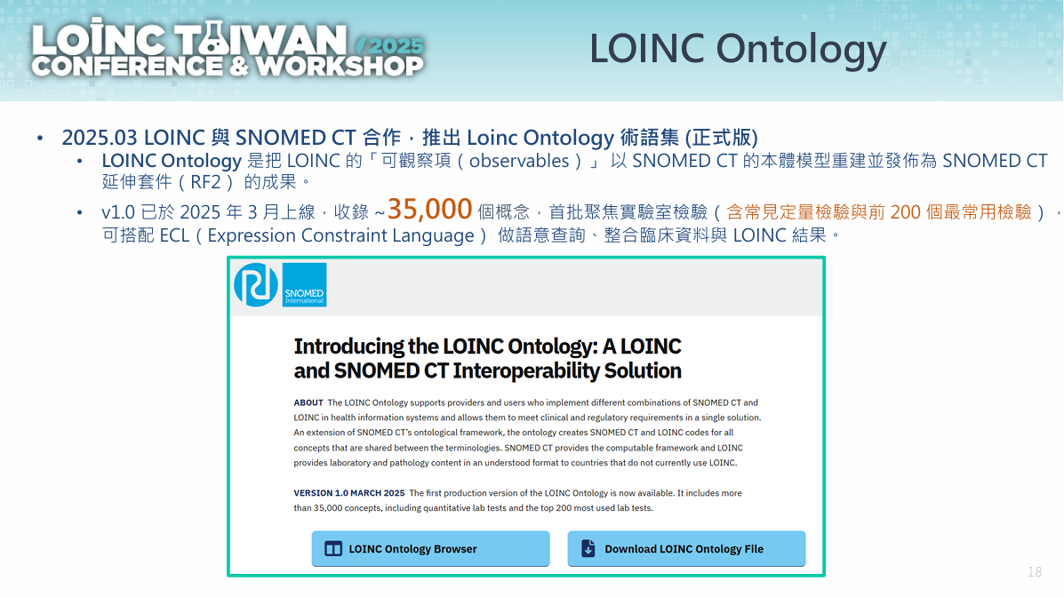 LOINC與SNOMED CT兩大國際組織自2012年合作以來,今年(2025)三月推出LOINC Ontology術語集,它是一個可供搜尋的網站。LOINC Oncology聚焦於約 35,000個最常使用的腫瘤學相關概念,並結合SNOMED CT階層式概念和LOINC 詳細描述,能從粗粒度(例如「某時間點量測濃度」)逐步精確到細粒度(例如「來自血液的葡萄糖」),且其搜尋介面與SNOMED CT相似,能同時顯示LOINC Code與SNOMED CT Code,便於精確搜尋特定臨床領域的需求。