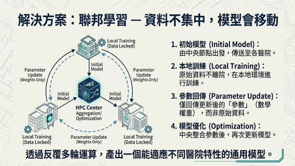 臺灣醫療資料分散,各家醫院的影像、訊號等非結構化資料無法集中,因此模型跨院會失準。聯邦學習(FL)讓資料不動、模型動,只需回傳參數即可,完全符合資料保護法及跨境規範。