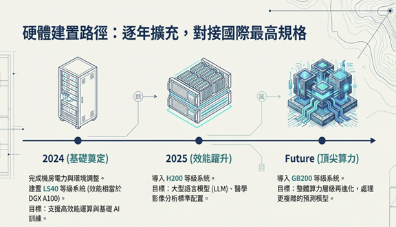 我們以「漸進式擴建、可持續升級」為核心策略建置 HPC。第一階段導入 NVIDIA L40S,第二年擴展至 H200 等高階 GPU;同步進行電力與水冷升級,使其能長期承載大型模型訓練量。