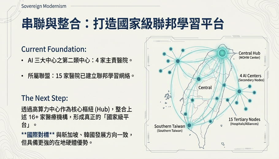 因此,我們啟動了國家級「主權 AI」願景:資料留在臺灣、模型留在臺灣、訓練環境留在臺灣,運算過程可被臺灣政府完全控管。這促成了衛福部資訊處建立高效能運算中心(HPC)與主權雲(Sovereign Cloud)的政策方向,也成為後續聯邦學習、國際合作及多模態醫療 AI 的基礎