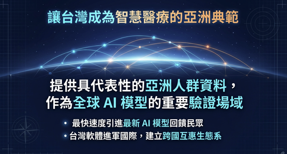 透過主權雲、HPC、聯邦學習與跨國合作,我們已建立從資料治理到模型落地的完整生態鏈,讓 AI 能真正走入臨床、普惠全臺,並成為亞洲醫療科技合作的核心。