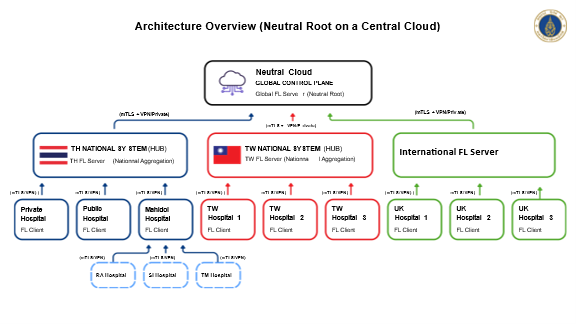 目前臺泰合作採用「雙國家級聚合(National Hub)+院所節點(FL Clients)」的架構設計:臺灣端使用主權雲與國家級 HPC 建置中央聚合伺服器;泰國端則由瑪希敦醫院及多家公私立醫院作為聯邦節點,兩國再共同連接至 Neutral Root(國際 FL 中控),以便後續擴大更多國家與機構的參與。這代表臺泰合作並非單一醫院之間的API串接,而是「國家核心 × 國家核心」的深度對接。