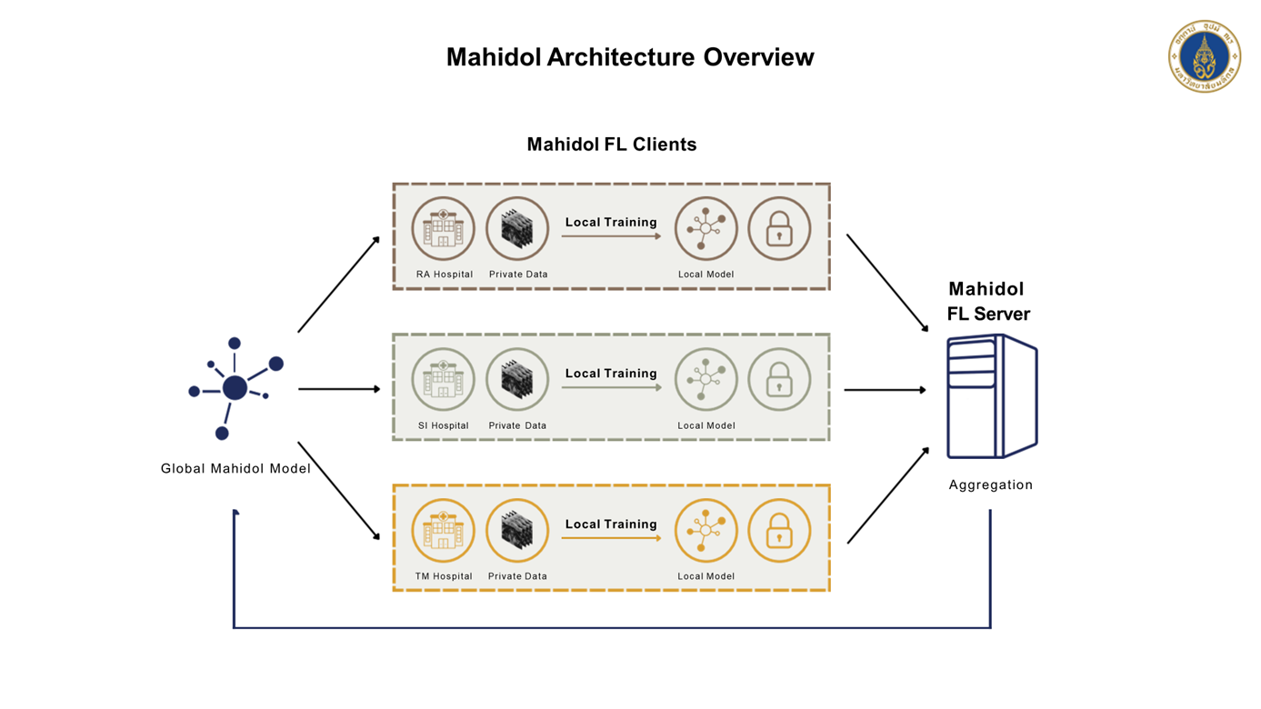 在資料無法集中、法律限制不同的前提下,臺灣與泰國皆認為聯邦學習(Federated Learning, FL)是跨國合作最可行且永續的解方。聯邦學習允許「資料留在各自的醫院」,僅將模型參數回傳至中央伺服器進行聚合,不需要移動任何病患個資,完全符合兩國隱私與法規要求。