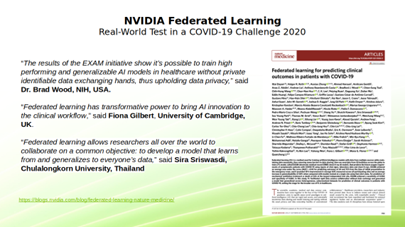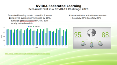 Andrew Feng 指出,數據是 AI 的基石,但在醫療與金融等高度監管的產業中,數據往往分散在各自的私有環境(Data Silos)中無法共享。NVIDIA 自 2019 年投入醫學影像切割的聯邦學習研究,核心使命即是「將分佈在各地的數據價值利用起來,同時嚴格保護數據隱私與合規性。」演講中回顧了 NVIDIA 聯邦學習技術的關鍵戰役。2020 年疫情爆發期間,NVIDIA 與麻省總醫院(Mass General Brigham)合作,針對 COVID-19 患者的氧氣需求預測開發 AI 模型。實驗結果顯示,全球 20 多家醫院(包含臺灣、英國等)透過聯邦學習訓練的模型,相較於僅用本地數據,平均精確度提升 18%,更重要的是模型的泛化能力(Generalizability)提升了 34%,證明了聯邦學習能有效提升模型在不同場域的適用性,此成果已發表於國際權威期刊《Nature Medicine》。