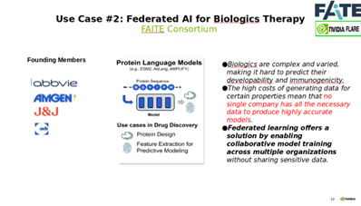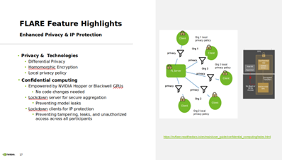 為了實現聯邦學習,NVIDIA 於 2021 年開源了 NVFLARE(NVIDIA Federated Learning Application Runtime Environment),致力於讓聯邦學習從學術研究走向落地應用。Andrew Feng 在演講強調了最新的安全技術整合,包括支援同態加密(Homomorphic Encryption)與差分隱私(Differential Privacy)的隱私保護技術以及結合 NVIDIA Hopper 架構 GPU的機密運算(Confidential Computing),不僅保護數據,更保護模型本身的知識產權(IP)。這確保了模型在參與方進行訓練時,權重與結構不會被竊取,解決開發者對於高價值模型外洩的擔憂。