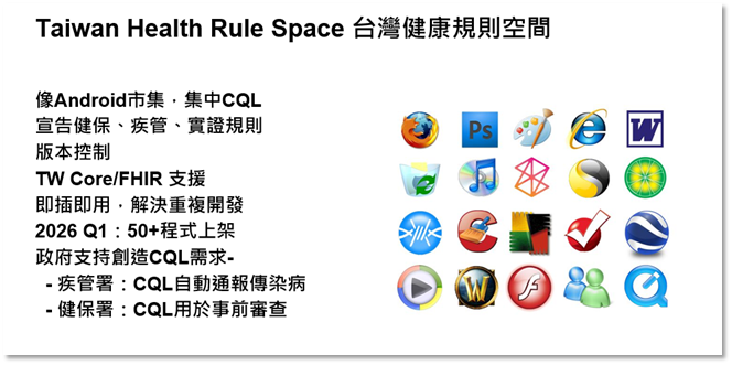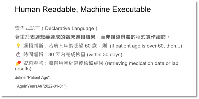 - 臨床規則統一:使用CQL標準,讓健保規定或醫學指引變成電腦通用的「邏輯語言」。