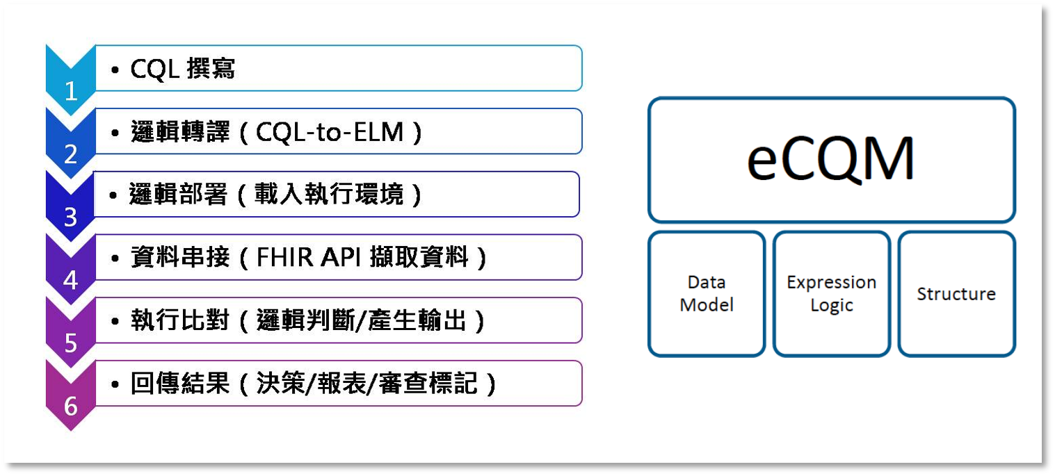 為了消弭上述落差,美國推動eCQM(Electronic Clinical Quality Measures,電子臨床品質衡量標準),eCQM的核心精神是將品質指標定義轉化為電腦可執行的標準代碼,而CQL正是撰寫與執行這些品質指標邏輯的語言工具,透過精確定義邏輯,取代模糊的文字敘述。CQL具備「人機共讀」特性,經由 ELM(Expression Logical Model)轉換後,可直接指揮電腦執行資料檢索與計算,針對病人資料進行自動邏輯判斷,產出所需的品質衡量結果;且一份CQL定義可重複用於不同醫院、不同系統、不同平台,大幅降低醫院資訊人員重複開發程式的負擔。