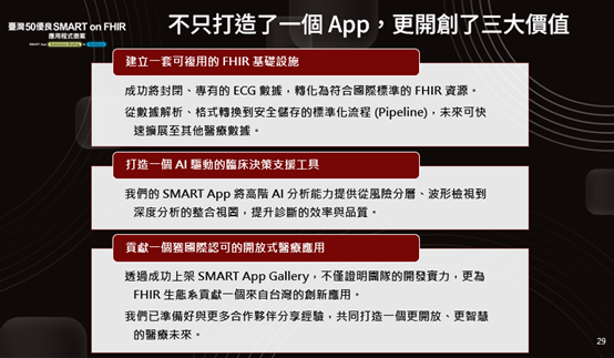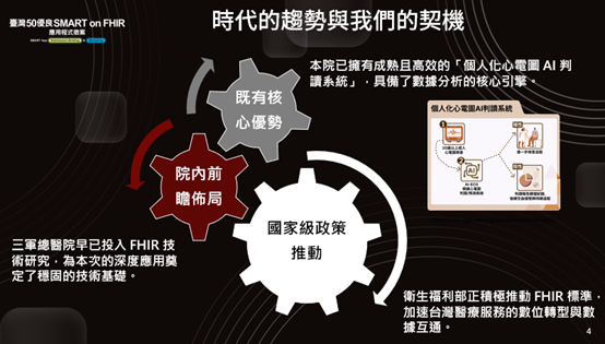 我們認為 SMART on FHIR 的機制非常好,它可以用同一套方式去讀取 FHIR 資料,讓系統達到互通。這類計畫(如 FHIR)不僅僅是技術縮寫,它們是建立臨床信任所需的基礎建設。