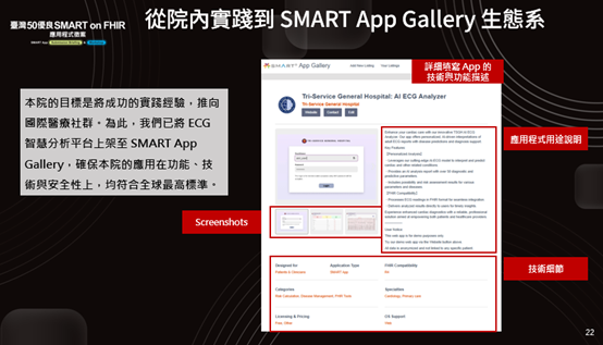 我們很高興我們的應用程式目前已上架到 SMART App Gallery。但由於心電圖本身不是沙盒預設就有的資源,病患清單是我們自行上傳的,暫時不能像其他已內建的資源那樣即取即用。我非常期待未來台灣的沙盒能夠補足這一塊,提供對應的範例資料,這樣大家開發起來就會快很多。