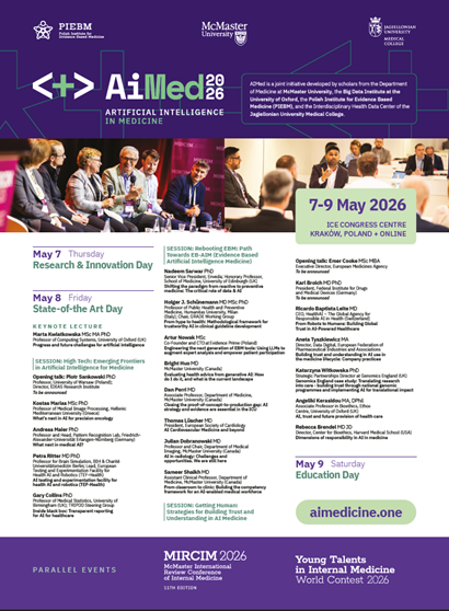 研討會由 McMaster University、University of Oxford Big Data Institute 及 Polish Institute for Evidence Based Medicine(PIEBM)等機構共同籌辦,歡迎集臨床醫師、AI 研究人員、開發者與各國政府及醫療管理單位報名參加。議程內容涵蓋 AI 模型研發、醫療影像、臨床決策支援、實證 AI 方法學(EB‑AIM)、資料治理與倫理規範等重點領域,是臺灣觀測國際趨勢、推動智慧醫療政策與法規的重要參考平台。